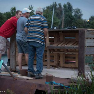 Voor het eerst bouwen, toch best spannend en wat een klus! Ook deze buurt werkt dit jaar met een actueel thema, iets met toen en nu… De gondel is nog niet vol gebouwd, maar er is veel wat er pas op het laatste moment kan worden opgezet, zo weet een buurtbewoner te vertellen. Maar het dek ligt erop en de basis is klaar. Er wordt nog eventjes doorgewerkt maar eigenlijk is het al wat te donker om nog echt wat te kunnen doen. De mannen ruimen de laatste spullen op, nog een wel verdiend biertje?